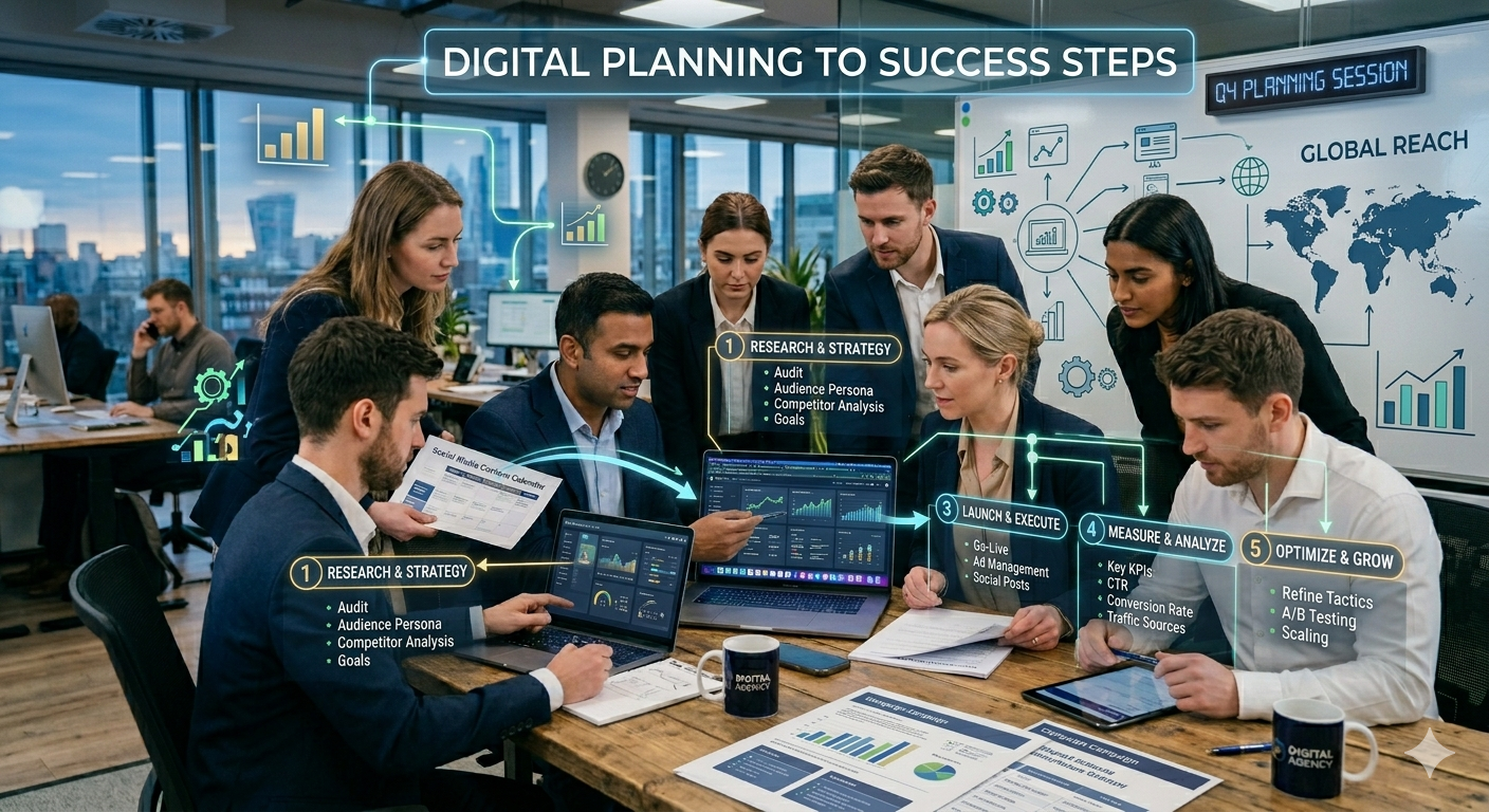 We believe that great results start with a solid blueprint. Our planning process is designed to turn your business goals into a clear, actionable roadmap. By analyzing market trends and audience data, we bridge the gap between where you are and where you want to be. Our 5-step approach ensures nothing is left to chance: Research & Audit: Understanding your current digital footprint