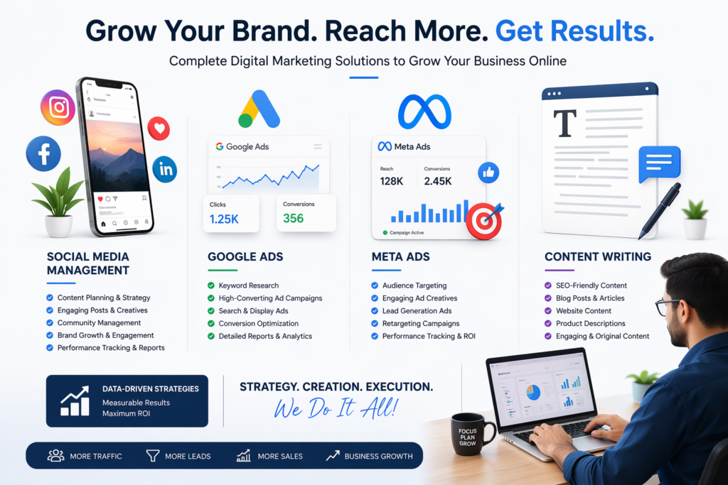 We provide result-driven digital marketing solutions designed to grow your business online. Our services include expert social media management, high-converting Google Ads and Meta Ads campaigns, and SEO-optimized content writing. With a data-driven approach, we help you increase brand visibility, generate quality leads, and maximize your return on investment.